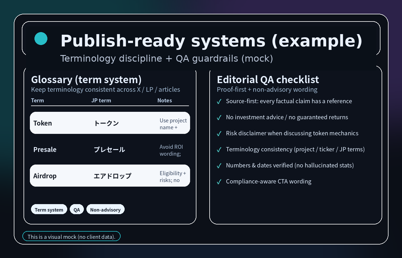 Example (mock): terminology system + QA checklist that keeps Japanese output consistent, proof-first, and safe. Tap to open full-size.